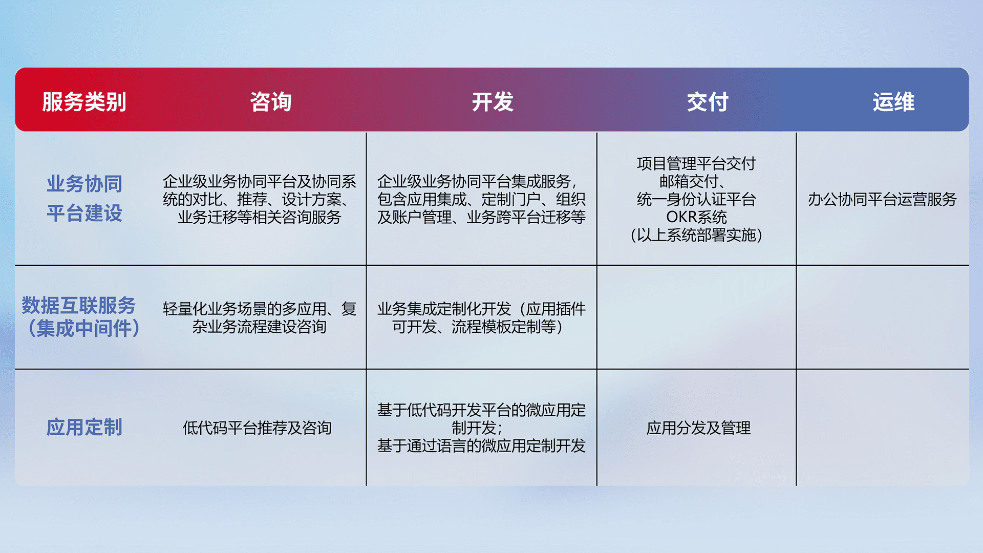 针对钉钉、、、企微、、IDaas等平台级产品提供产品的规划、、、方案、、交付、、、定制化开发等服务,,,,实现如统一协同办公、、智能客户服务、、混合会议管理、、、、智能数据查询、、、等业务场景,,实现数字化转型。。。